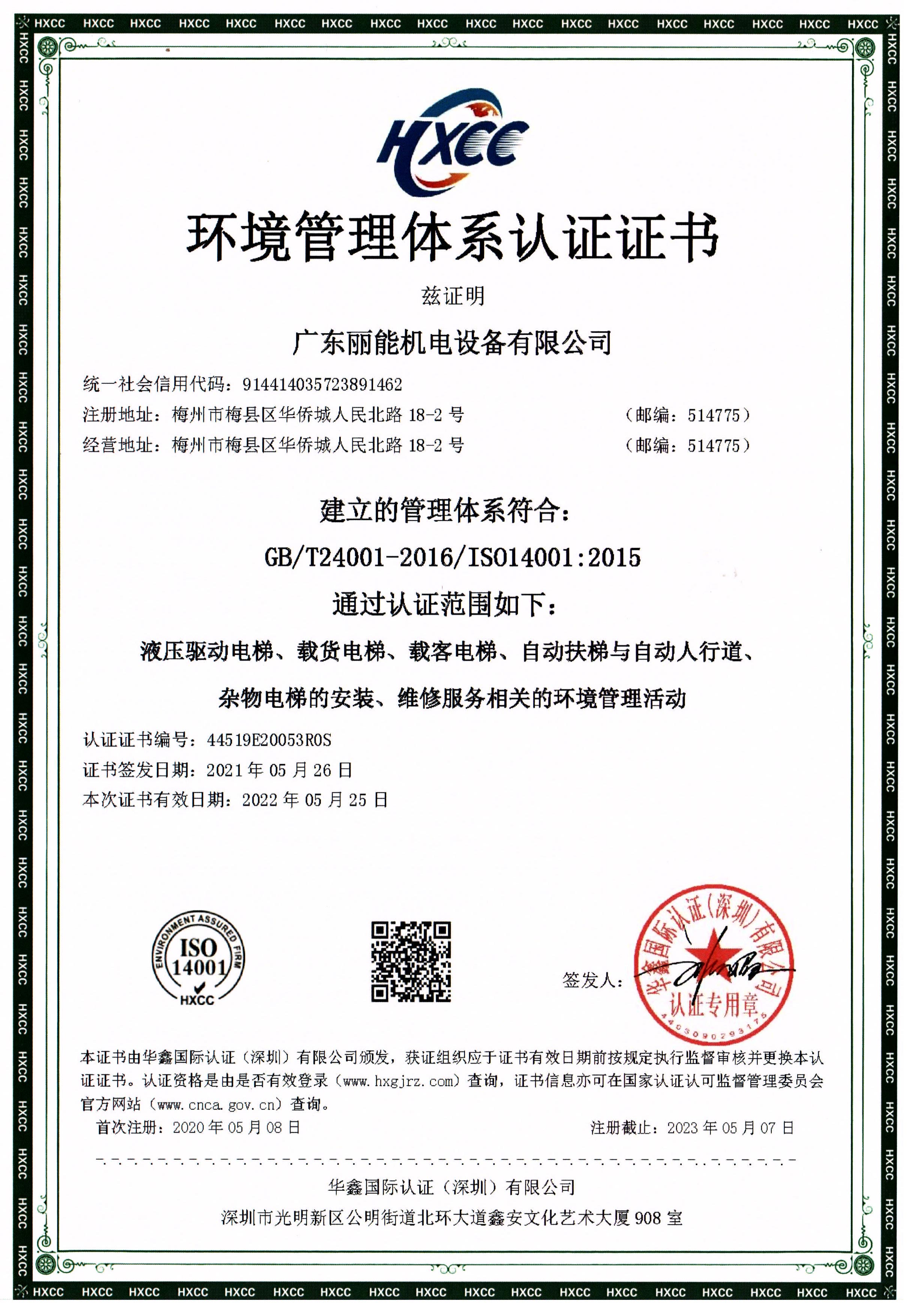 環(huán)境管理體系認證證書【GB/T24001-2016/ISO14001:2015】