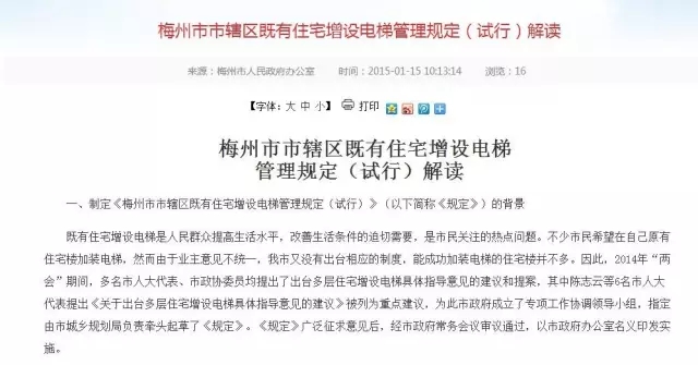 據小編了解,早在2015年,梅州市人民政府就已經制定《梅州市市轄區既有住宅增設電梯管理規定(試行)》(以下簡稱《規定》)